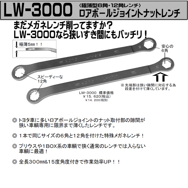 This is a wrench that is thinned to the limit, especially for vehicles where the gap between the nut mounting part of the lower ball joint, which is often found in Toyota vehicles, is narrow.