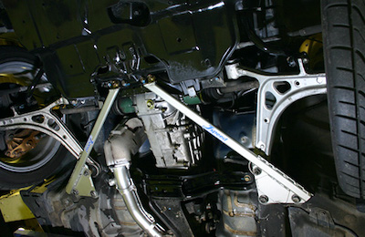 It directly suppresses the swinging of the front cross member and also suppresses the twist of the front frame. Simultaneously increase the rigidity of the front and rear lower arm pivots. Although it is a simple part, the effect is a clear double effect.