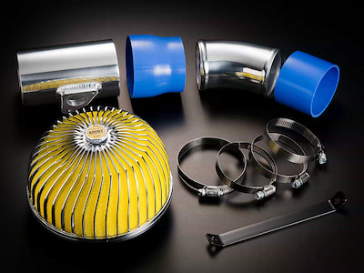 This suction pipe kit contains air-flow adapter and air cleaner. The considerable power loss occurs in the stock cleaner box by the inhalation resistance. The un-covered air cleaner and the air-flow adapter will attain the superior power. And, the atmosphere of the engine room is favored by buffing aluminium pipes and silicone hoses.