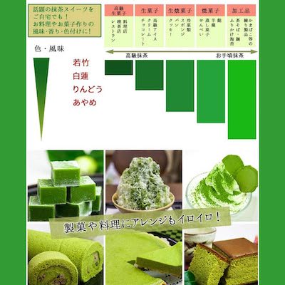 A domestic matcha tea with a refreshing scent and strong bitter flavor. Recommended for cold sweets, baked goods, bread dough, etc. Nationwide Tea Reviews Prize, Kindergarten Exhibition Tea Award, Ministry of Agriculture, Forestry and Fishery