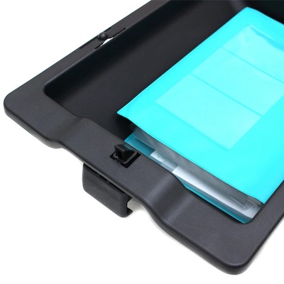 This is a pull-out storage tray that can be attached to the footwell of the passenger seat.
