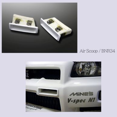 The Air Scoop for BNR34 GT-R increases the air intake to the intercooler located behind the front bumper, and raises the refrigeration capacity of the intercooler.