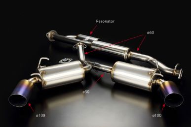 Center pipe (Stainless): Ø60mm + Rear branch part (Stainless): Ø50mm x 2 + Twin silencers (Stainless): Ø150mm diameter + Tail pipe (Titanium): Ø100mm