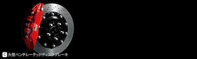 Brakes: Large diameter ventilated disc brakes ( Floating (front only), drilled disc) + monoblock opposed front 6-pot, rear 4-pot calipers (red paint/with GR logo)