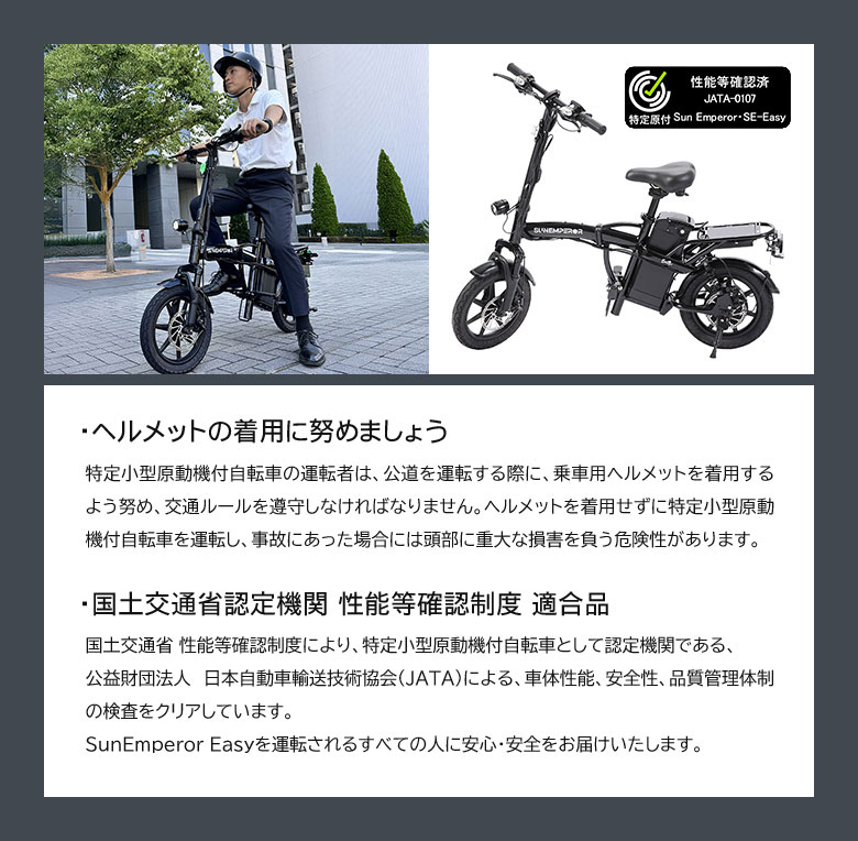 【特定小型原動機付自転車】Easy こがない自転車 免許不要 電動バイク 電動キックボード 電動モビリティ バッテリー 高機能 坂道 車道 歩道 走行可能 安定 折りたたみ コンパクト スマートキー イージー サンエンペラー Sun Emperor