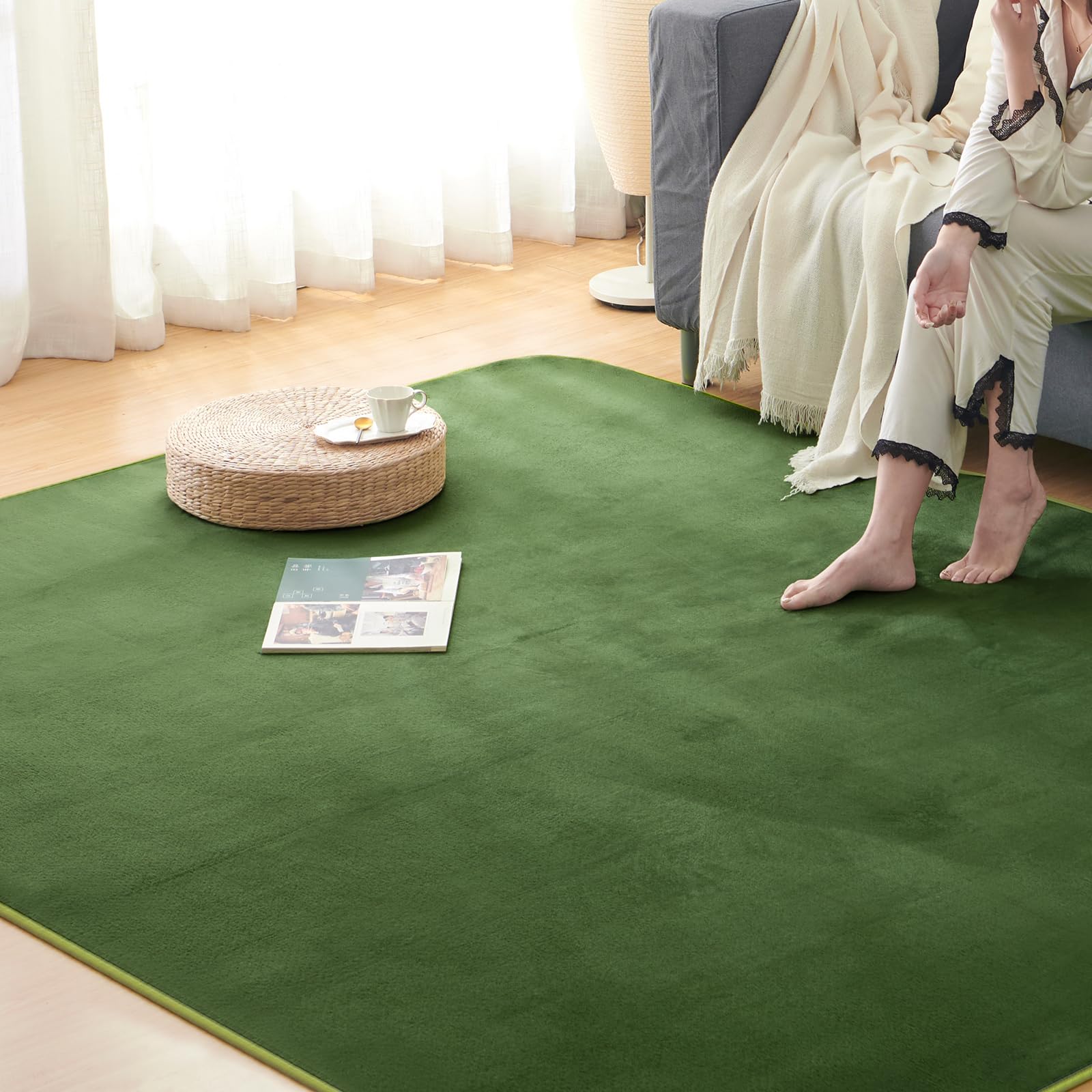 【送料無料】Keusnix カーペット ラグ ラグマット滑り止め付 洗える 135x185cm 約1.5畳 絨毯 防ダニ 抗菌 防臭 オールシーズン快適に使用 床暖房 ホットカーペット対応 ふわふわ肌触り フランネルラグ 無地 グリーン