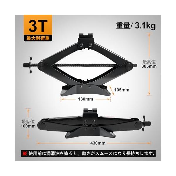 ・[耐荷重3T]パンタジャッキの最大荷重は3.0T、車用揚程100mm〜400mm。※商品を受け取った後、初めて使用する際は、ラチェットレンチを使用して最初に持ち上げると、より楽に作業ができます。ご使用前に潤滑油を塗布すると、よりスムーズに作動し、製品寿命も延びます。