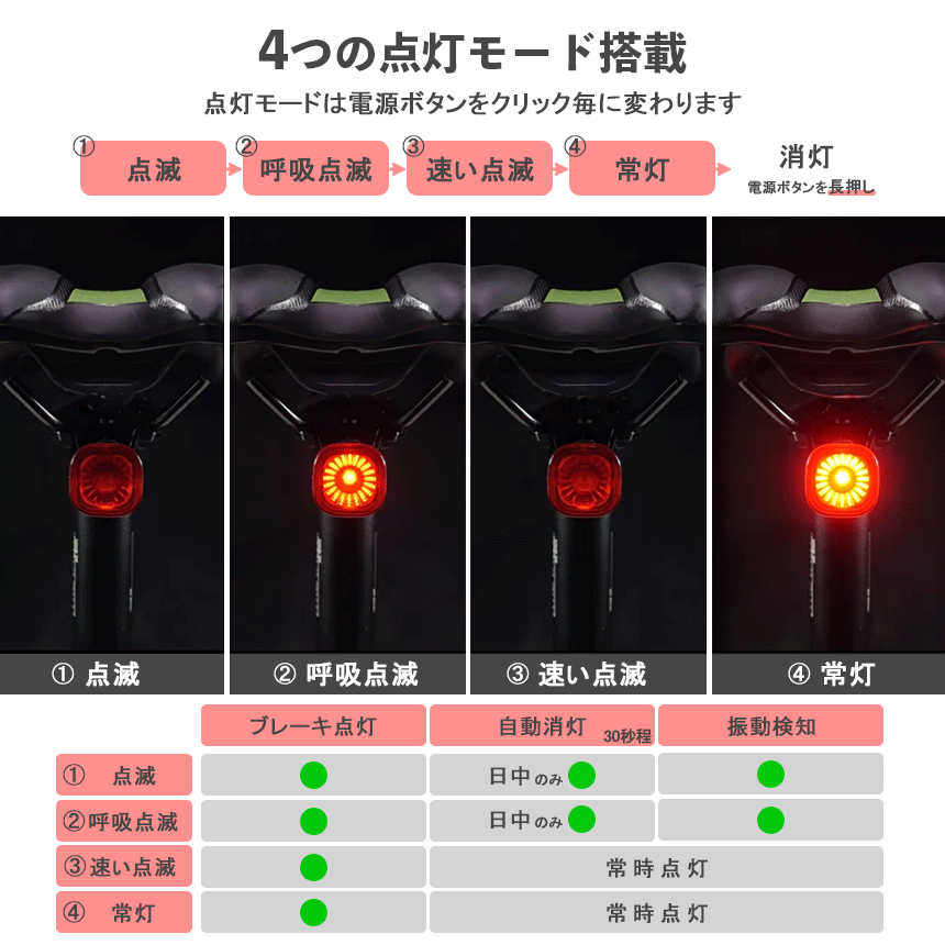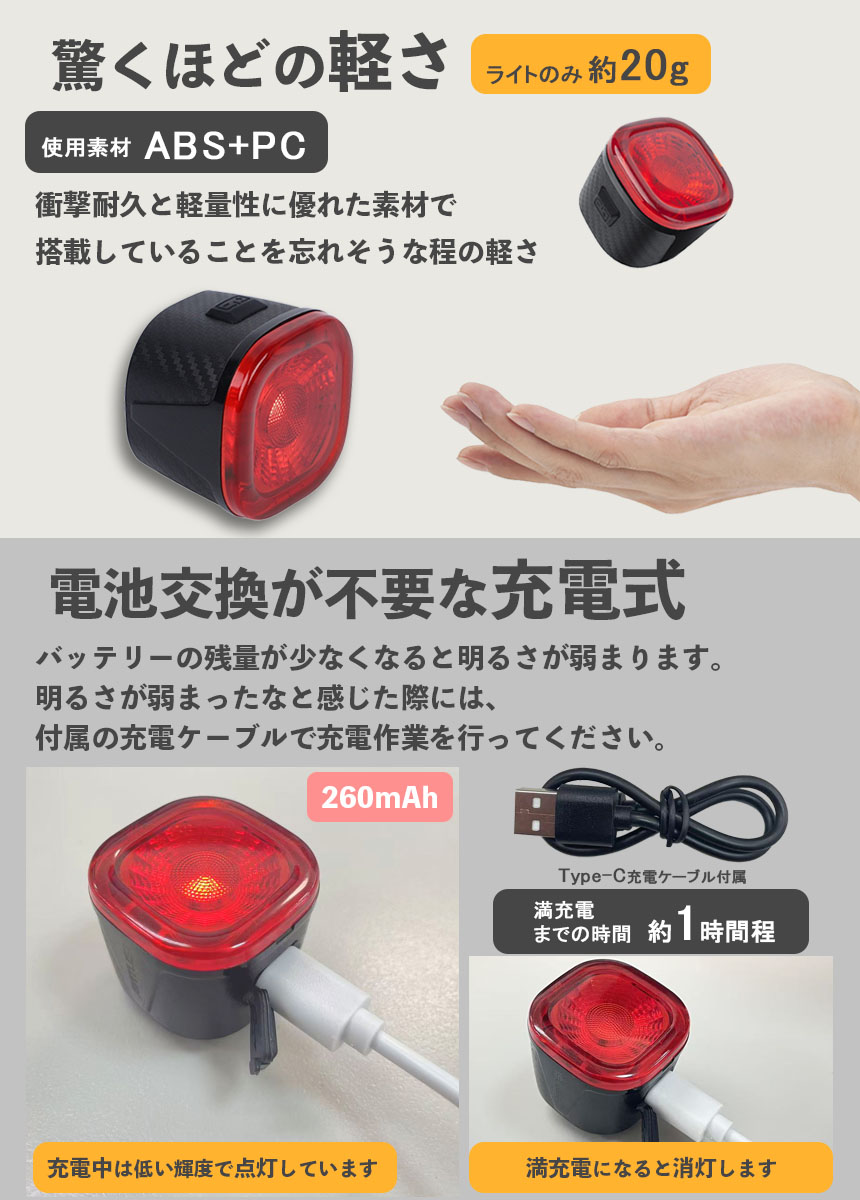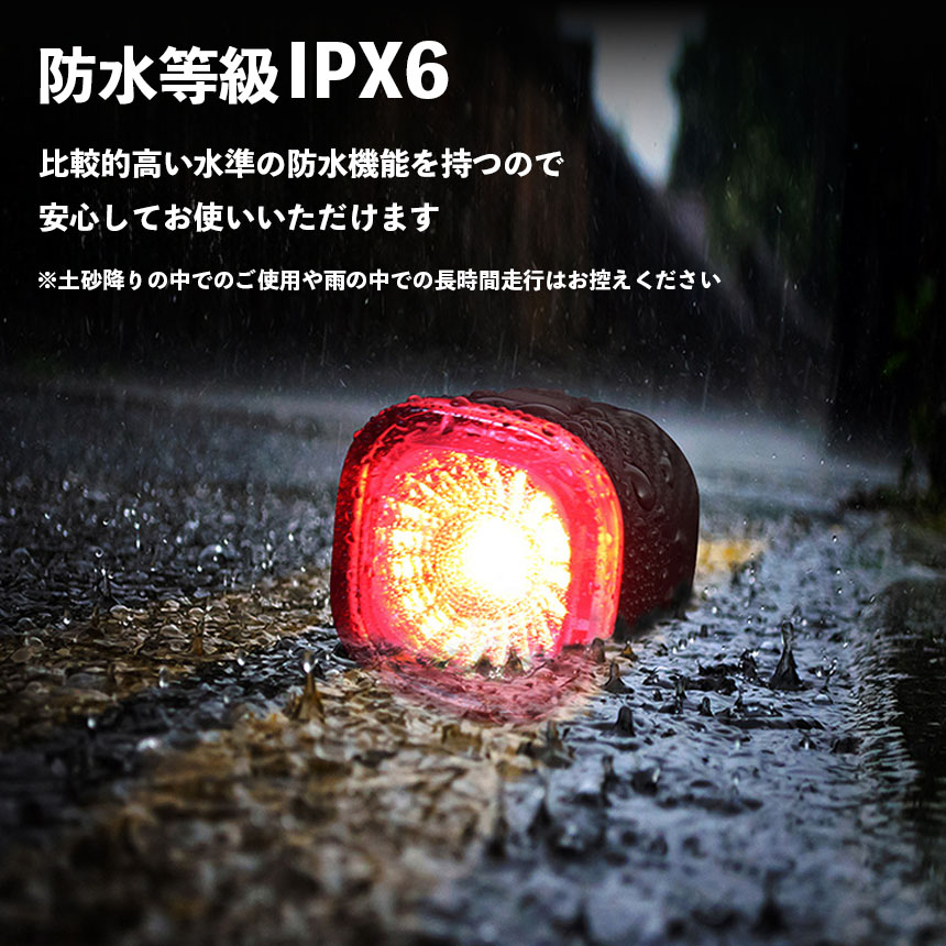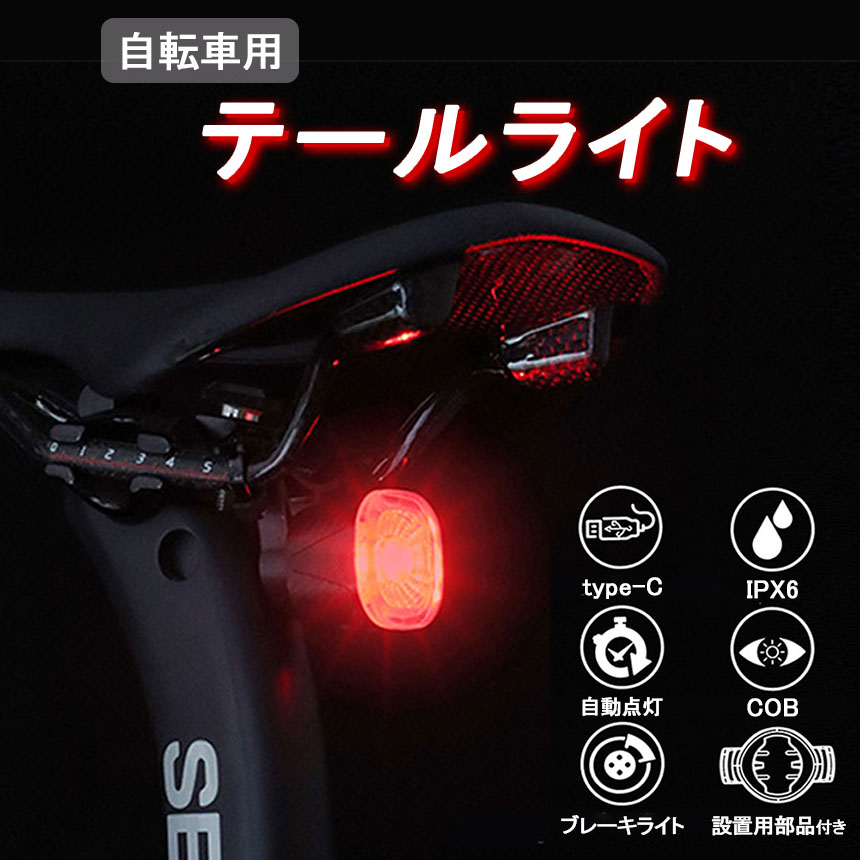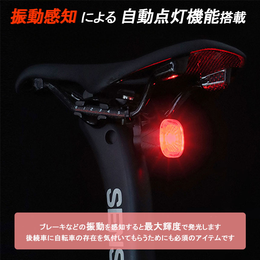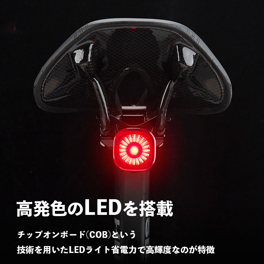 自転車 ライト テールライト リアライト 後ろ オートモード LED 赤色光 USB充電式 マウントセット USB充電 明るい 充電 自動点灯 防災 夜間走行 マウンテンバイク 自動消灯 ブレーキ ブレーキセンシング 明るさ 振動 感知 IPX6 ランプ 尾灯 バックライト COB 高輝度