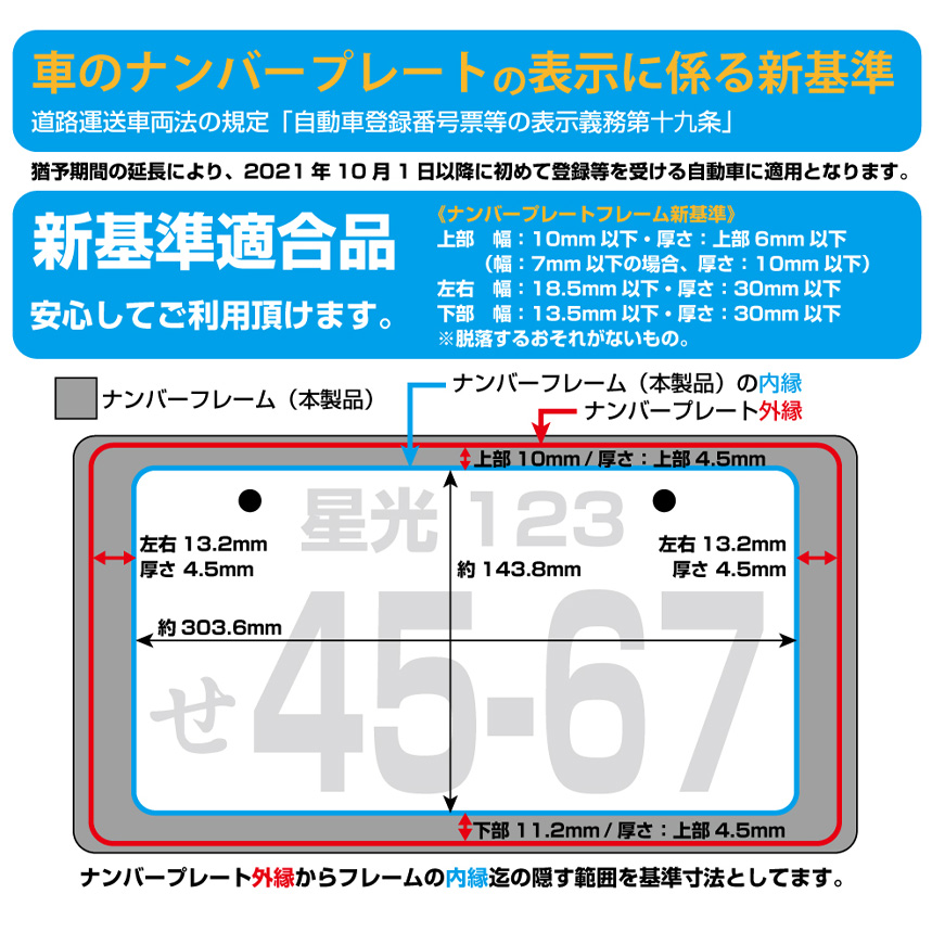 ワイドでよりボディーにフィット、2種類のメッキ表現(艶消・光沢)を施したナンバーフレーム。2022年(R4年)2/1現在の基準・法規定適応。