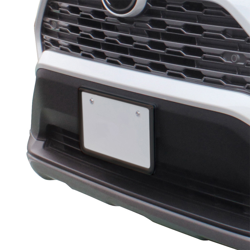 傷つきにくい軟質素材を採用したナンバーフレーム。リアの封印そのままに取付できるフロントリア共通形状。