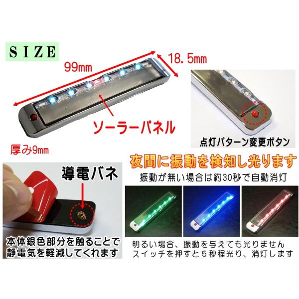LED警告灯 静電気除去 ソーラーパネル搭載 RGB点滅 感光センサー 振動検知 ワーニングランプ ストロボフラッシュ ドアガード