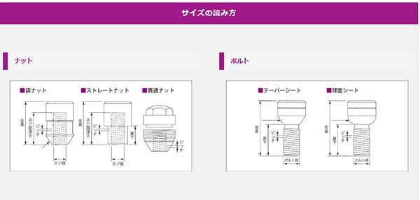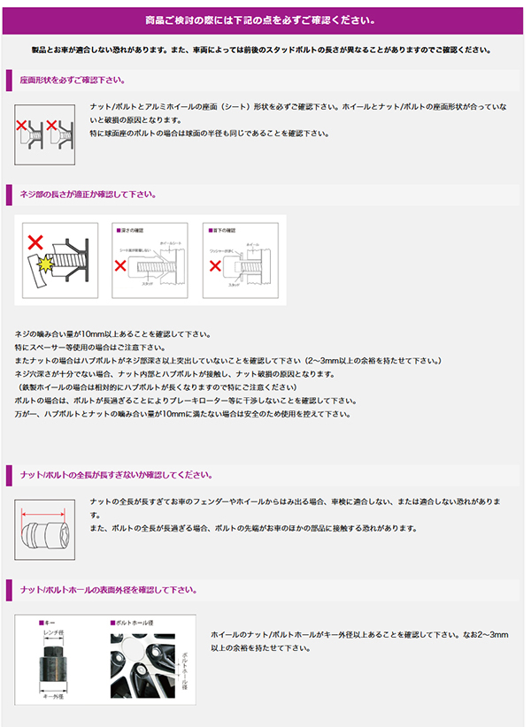 ナット/ボルトとアルミホイールの座面(シート)形状を必ずご確認下さい。