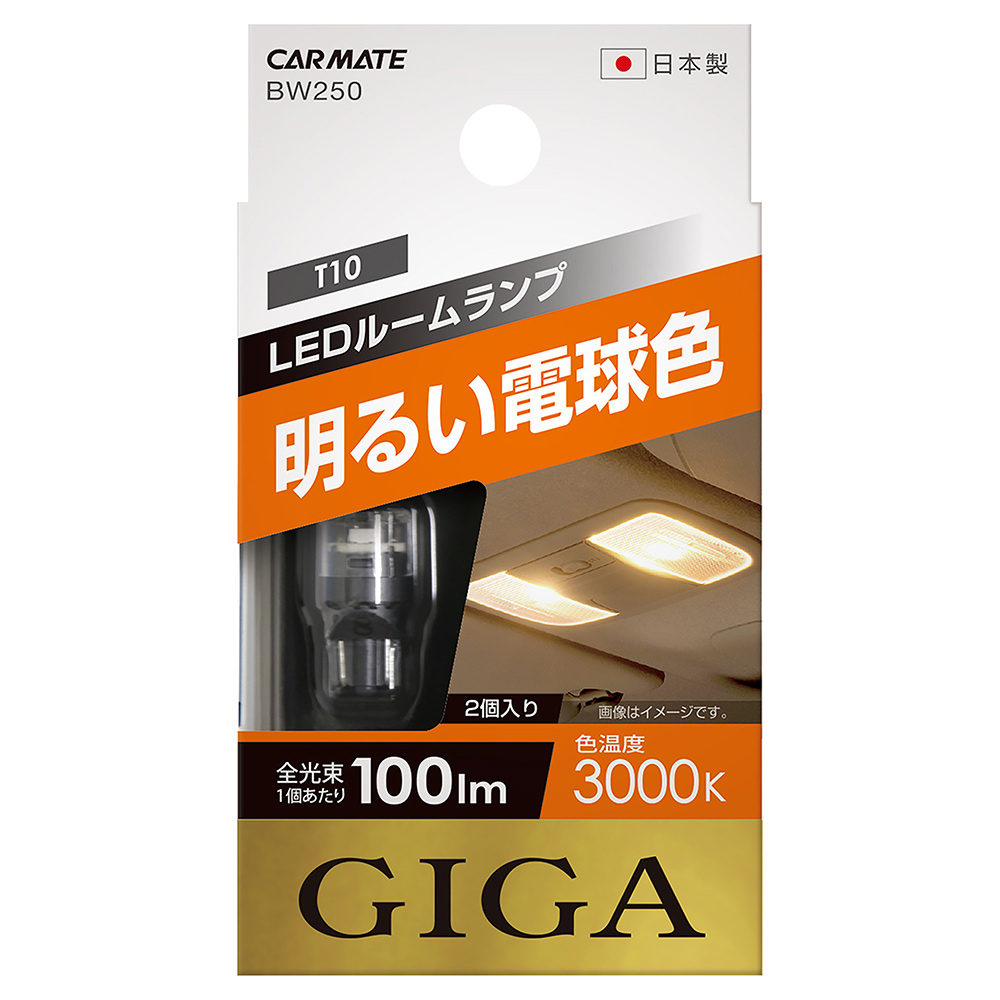 ledbulb-t10 車 LED ルームランプ T10 BW250 GIGA LEDルーム R100T 100lm 3000K 明るい電球色 2個入り 車用 12V 日本製 車検対応 carmate
