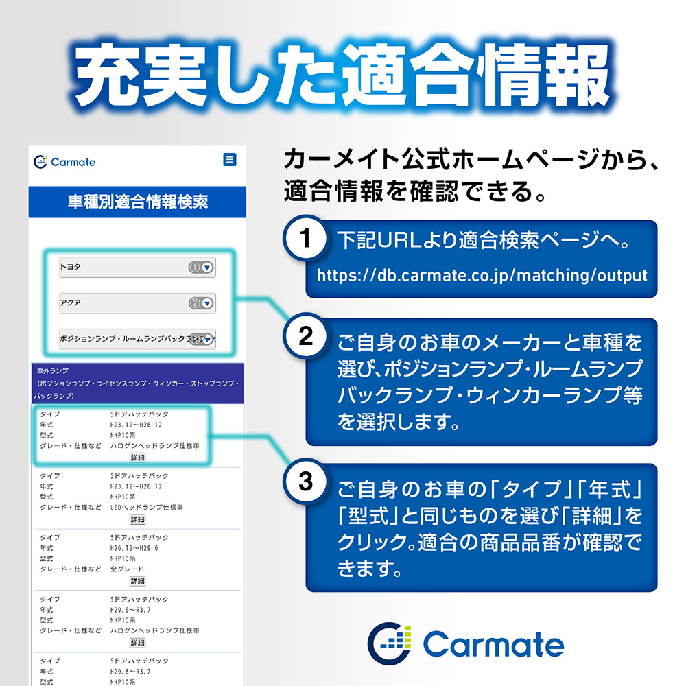 カーメイト公式ホームページから、適合情報を確認できます。