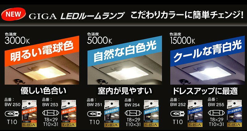 純正白熱球比約2倍の明るさ!明るい電球色のLEDルームランプ ・3000Kの明るい電球色 純正白熱球比約2倍の明るさ!明るい電球色のLEDルームランプ ・優れた放熱性能で明るさを長時間キープ 車内が明るく、見やすくなる! ・3000Kの明るい電球色 ・集光レンズ採用、強力な直進光! 多くの車に取り付け可能 簡単取付 日本製 GIGAについて 充実した適合情報 【重要】ご購入前に車への適合(装着可否)について事前に【必ず】ご確認ください。 当社は、独自の調査システムで実車による装着テストを行っています。実車調査の終えたものから、装着可否情報を公開しておりますので、ご購入前に必ずご確認ください。適合品番や取付方法などよくわからないときは、「商品よりお問い合わせ」いただくか、カーメイトサービスセンターまでご連絡ください。 おすすめ車種 適合車種一例 必ずお読みください 品番 BW250 T10タイプ 品番 色温度 3000K 5000K 15000K 全光束 100lm 110lm 65lm T8×29 / T10×31 タイプ 品番 色温度 3000K 5000K 15000K 全光束 100lm 110lm 65lm 【ブランド】 【発売元、製造元、販売元】 リニューアルに伴い、パッケージ・内容等予告なく変更する場合がございます。予めご了承願います 広告文責 [カー用品/ブランド:ギガ(GIGA)/]