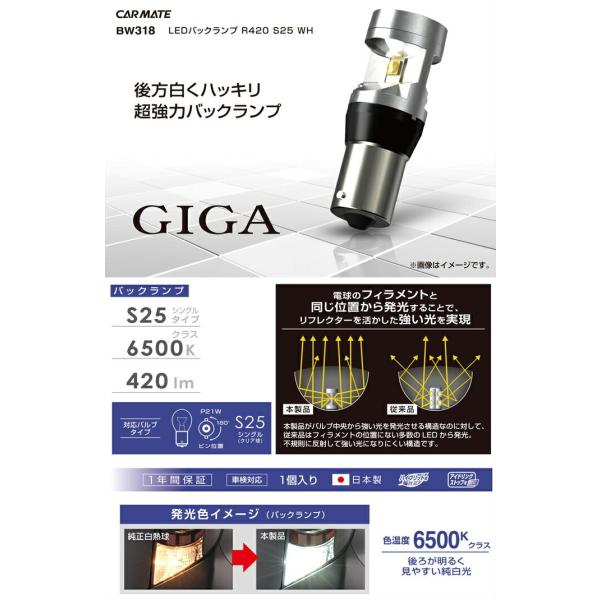 LED バックランプ 車 BW318 GIGA LEDバックランプ 6500K 420LM S25 1個入り 日本製 車検対応 1年間保証 carmate ledback-s25