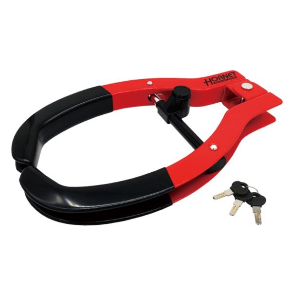 HORNETのロゴが目立つ赤色ベースのタイヤロック。犯罪抑止効果は抜群です。