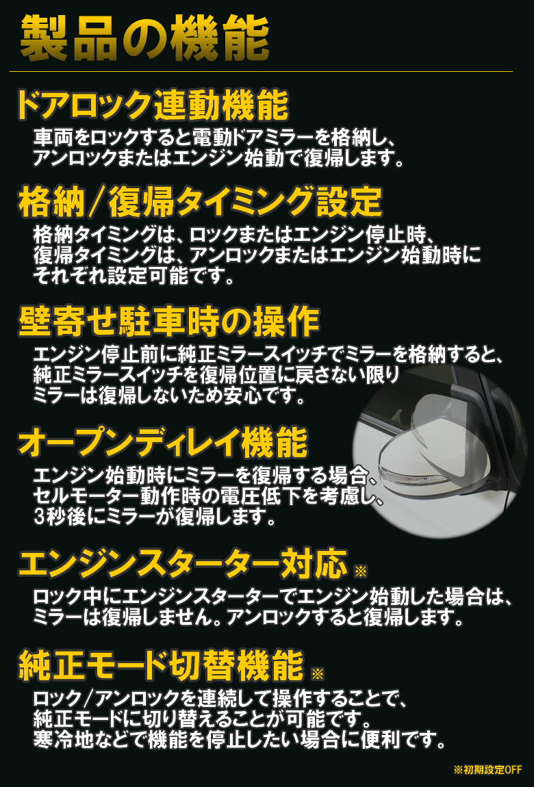 ■ドアミラー復帰のタイミングはエンジン始動・アンロック時のいずれかをお客様サイドで選択可能。