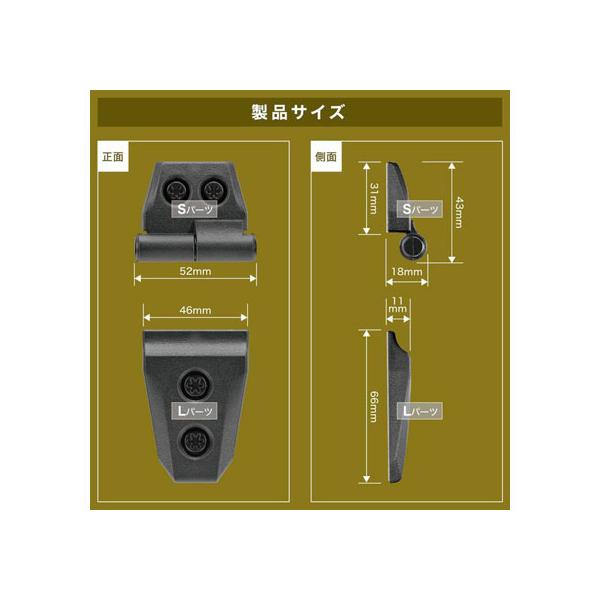 【商品説明】粗い表面デザインとトルクスナットのデザインを組み合わせ、ゴツゴツとしたワイルドなデザインに仕上げています。金属パーツを使わずに耐候性能の高い樹脂を使用することで、錆びることもなく長期間使用していただけます。【仕様】●カラー:ブラック(2セット入) ●サイズ:高さ53×幅100×奥行18mm ●重量:46g