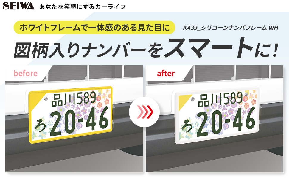 【在庫限定特価!】SEIWA K439 シリコーン ナンバーフレーム ホワイト 普通乗用車 軽自動車 取り付け 車 ドレスアップ 外装 セイワ