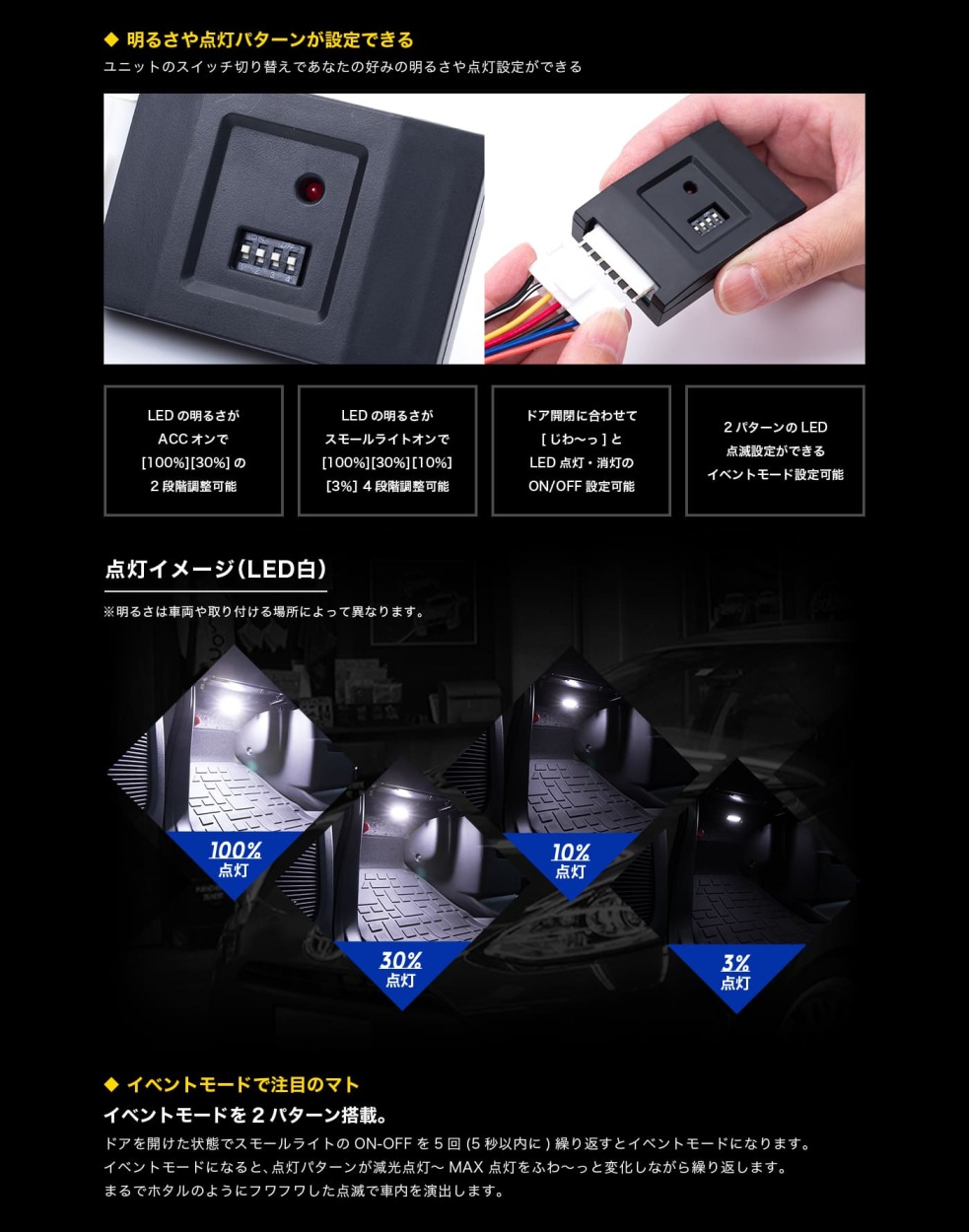 4段階(100%・30%・10%・3%)の明るさ設定機能付。
