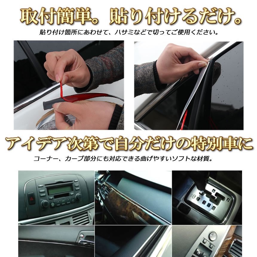 メッキが際立つモール!愛車を高級感のあるメッキモールで簡単にドレスアップ!ドアのキズ防止(プロテクター)としても役立ちます。剥離紙をはがして貼るだけの簡単取り付け!裏面に強力な両面テープ付。作業完了後に表面の青い保護フィルムをはずしてください。お車のドレスアップやボディ保護に大活躍!ドアバイザーやドアサイド、フロントグリルフロント、サイド、リアなど貼り付け箇所はアイデア次第!長さはたっぷりの15m巻き!貼り付け箇所にあわせて、ハサミなどでカットしてご使用ください。・コーナー、カーブ部分にも対応できる曲げやすいソフトな材質。・裏面に強力な両面テープ付き。幅 6mm / 10mm / 15mm / 20mm のサイズあり!幅は商品タイトルに記載の幅のサイズとなります。送料無料【クレジット決済のみ】 代引き決済の場合は送料755円発送前に加算させて頂きます ※北海道は+215円UP、離島地域及び沖縄県は+2000円UPにて承ります。