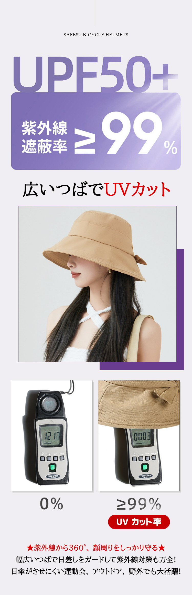 - 幅広いつばで360°紫外線から顔周りをしっかり守る。