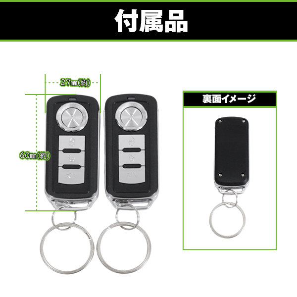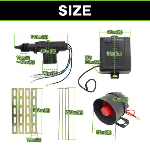 | 【商品説明】 アンサーバック機能付きのキーレスエントリーキット アクチュエーター付きなので、集中ドアロックが付いていない車両にもご利用いただけます。 誤動作防止に優れたキーホルダー型リモコン2個付です ※24V車でも2個あるうちの片側のバッテリーにプラスとマイナスを接続することで、12V車と同じく使用出来ます。 ※汎用のステーも付属しますので、タイトルの車種以外でも、ほとんどの国産12V車に取り付け可能です。 |