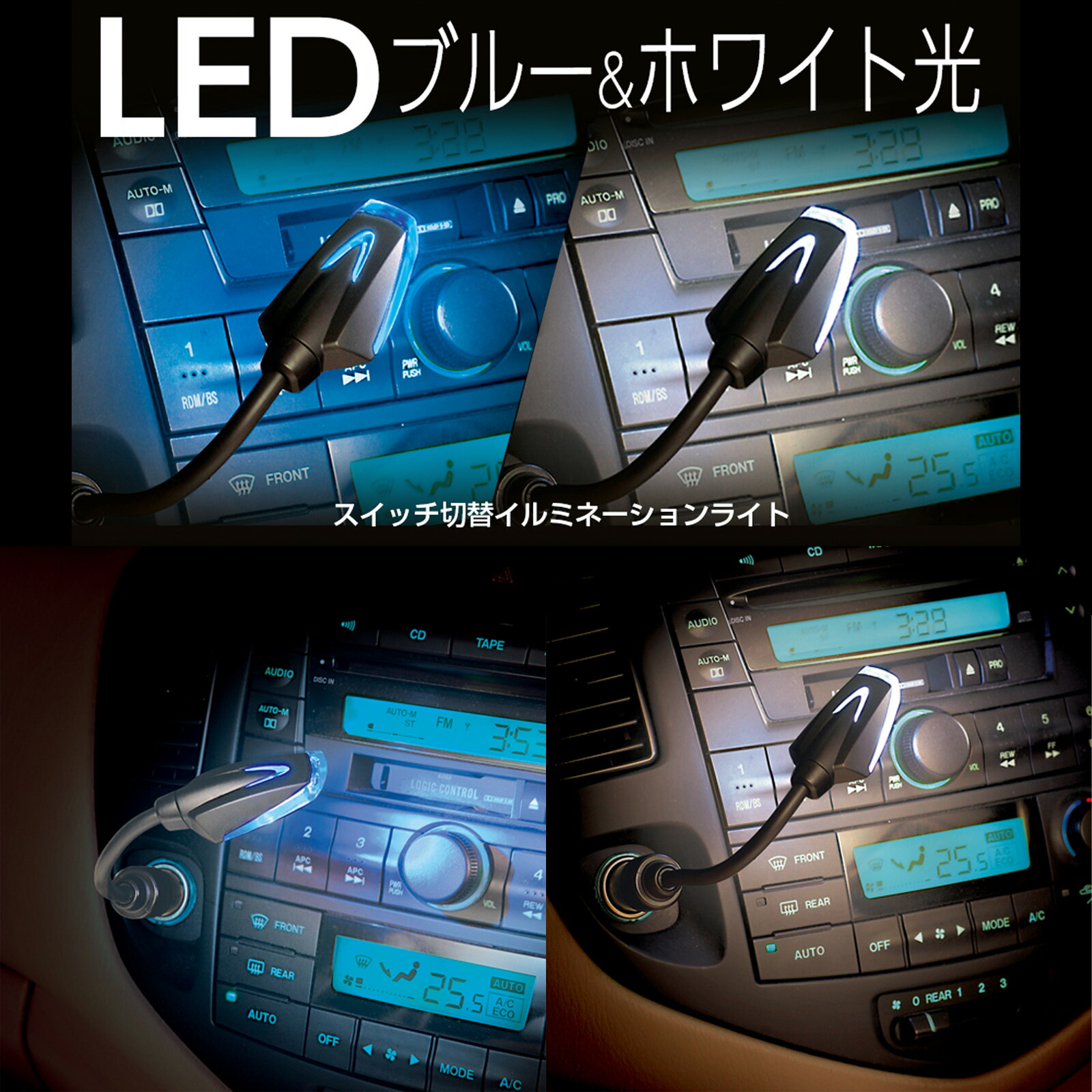 | 車のシガーライター電源を利用し、カーオーディオや灰皿等を照らすイルミネーションライトです。 ブルーLEDとホワイトLEDの光をライト部のスイッチで切り替えできます。 フレキシブルアームでライトの角度を自由に調節できます。 ライト部上面にはイルミネーション色が確認できるウインドウが付いています。 球切れや消費電力の少ない高輝度LEDを採用。 |