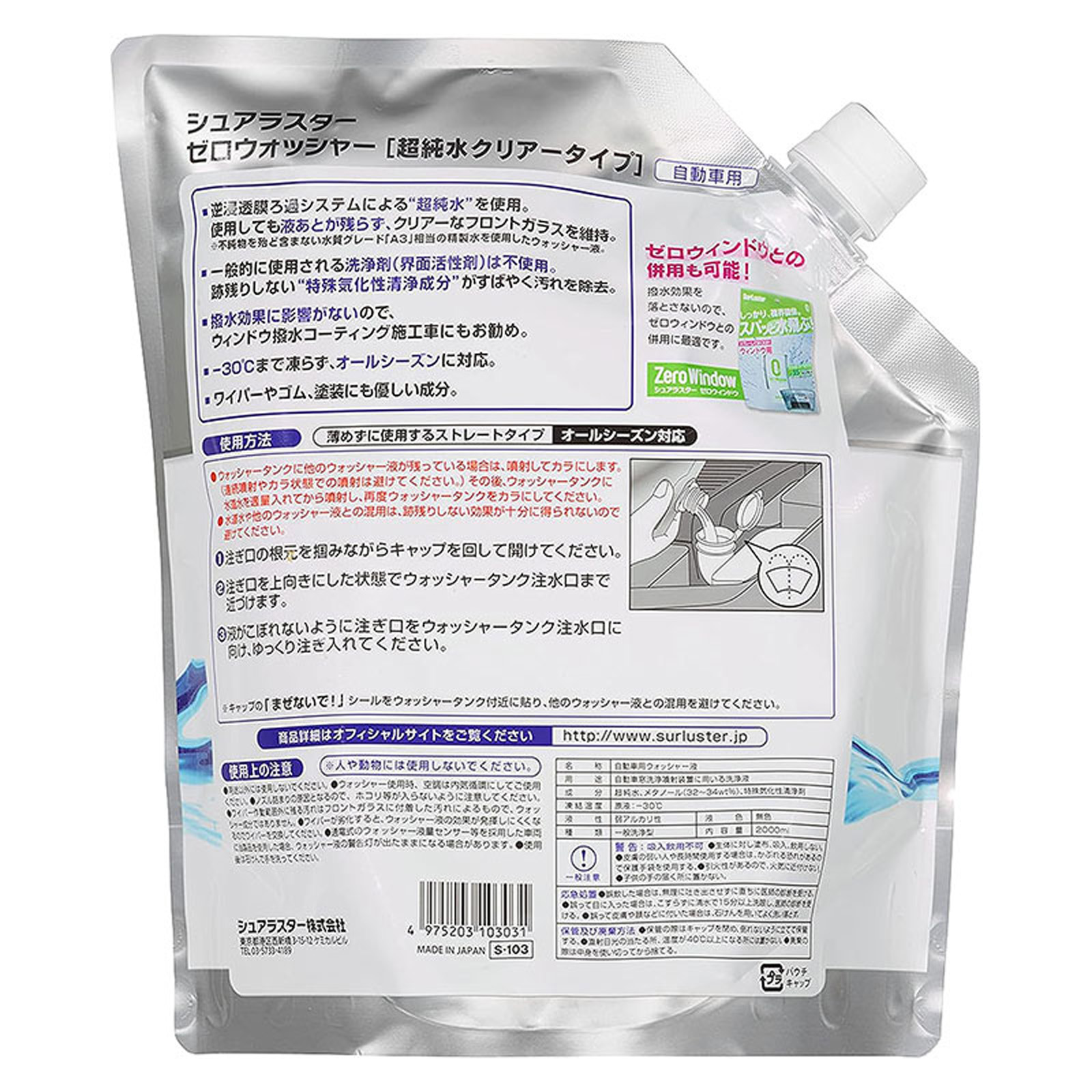 ゼロウォッシャー 超純水クリアータイプ 2L ウォッシャー液 メンテナンス 補充 希釈不可 オールシーズン対応 シュアラスター cg-sl-S-103