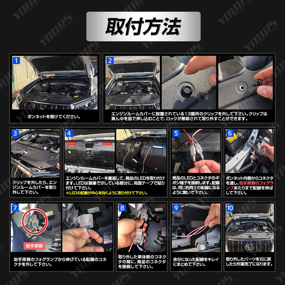 | ■本品はフォグランプのON/OFFに連動して、グリル内に設置したLEDが点灯する商品になります。 ■本品またはご使用の際のキズ・破損等に対する保証はございません。ご使用は自己責任にてお願い致します。 |