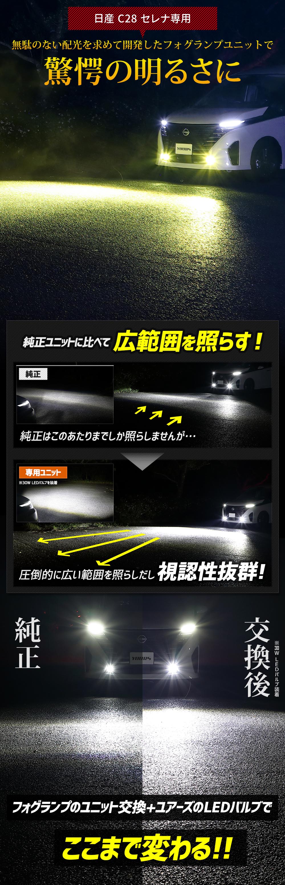 [予]セレナ C28 専用 フォグランプユニット + LEDバルブ [30Wホワイト/2色切替/24W]セット ユアーズ YOURS 日産 L1B [8]