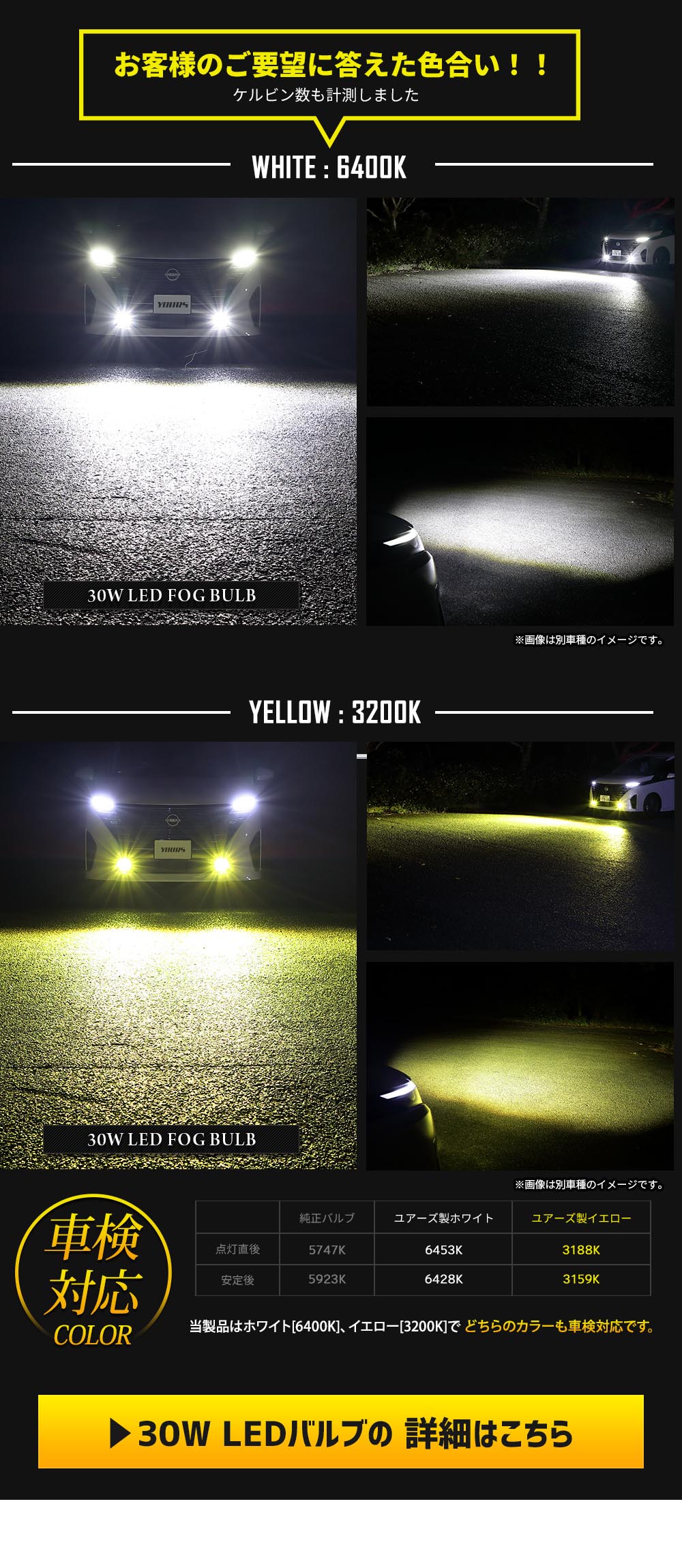 | ユニットを交換するだけで格段に明るくなる! フォグランプユニットと、ユアーズの2色切替LEDフォグバルブがセットになりました!! 明るく鮮やかにするLEDバルブに、イエローとホワイトの2色切替ができるバイカラーバルブが登場! カラーはホワイト6000Kとイエロー3000Kを手元のフォグスイッチで瞬時に切り替え可能です。 純正LEDは片側350ルーメンに対し、本製品は片側1500ルーメンと、純正LEDの2倍以上の明るさ! 純正のLEDフォグランプに物足りなさを感じているオーナー様にうってつけのおすすめカスタムパーツです! 点灯カラーはお客様アンケートを元に、お客様の求めるベストな色味を追求しました! 青すぎずに黄色っぽさもないホワイトの6000Kと、悪天候でも視認性抜群のイエローの3000Kの2色を一つのバルブで楽しめます♪ IP68と優れた防水/防塵性能。 機能性を最重視し、放熱性を徹底的に追求したヒートシンク形状で耐久性も◎。 ユニットも純正と同サイズのため、ユニットを交換して、LEDを装着するだけでOKです! |