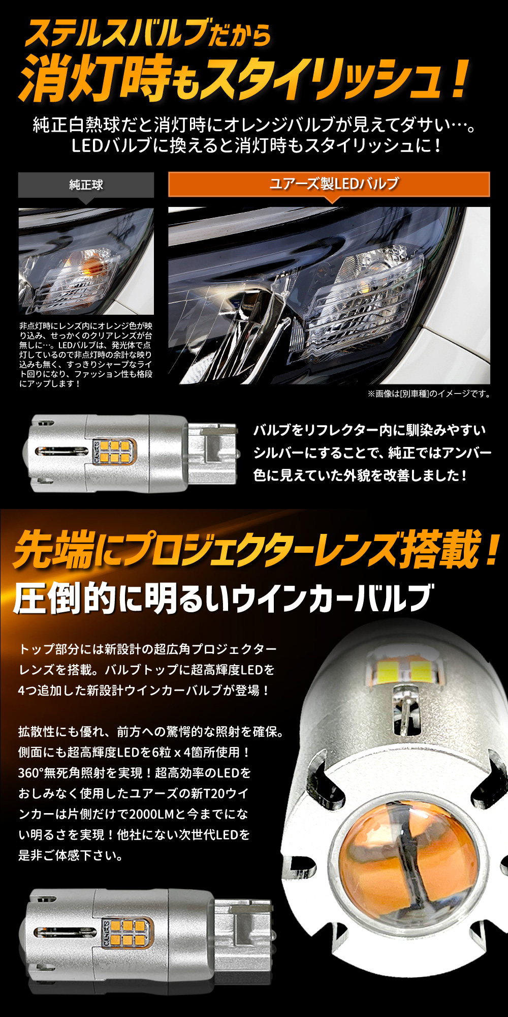 | 先端にプロジェクターレンズ搭載LEDを装着で2000LM! 圧倒的に明るいウインカーバルブ トップ部分には新設計の超広角プロジェクターレンズを搭載。 バルブトップに超高輝度LEDを4つ追加した新設計ウインカーバルブが登場!拡散性にも優れ、前方への驚愕的な照射を確保。 側面にも超高輝度LEDを6粒x2箇所使用! 360°無死角照射を実現!超高効率のLEDをおしみなく使用したユアーズの新T20ウインカーは片側だけで2000LMと今までにない明るさを実現!他社にない次世代LEDを是非ご体感下さい。 |