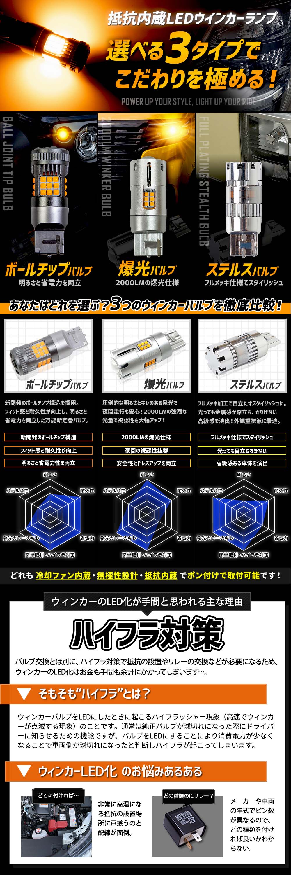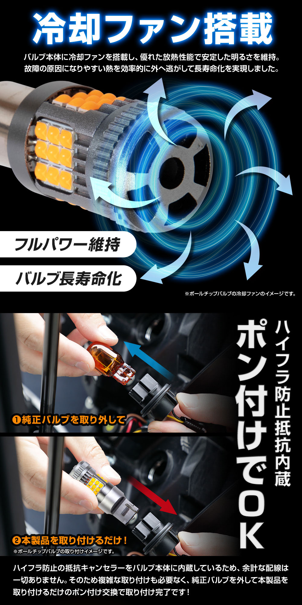 | ■無極性設計 極性を気にすることなくすぐに取付が可能。 ■冷却ファン搭載 しっかりした放熱対策でより長寿命化! 熱のこもりやすいバルブ先端部分に冷却ファンを搭載することにより放熱効率が格段にアップ! 故障の原因となる熱を効率的に逃がすことでフルパワー点灯をしっかり維持&長寿命なLEDバルブにすることに成功しました。 ■抵抗内蔵で誰でも簡単LED化 交換するだけでキレも抜群のLEDウィンカーに!ファッション性も格段にUP! 別途抵抗不要! LEDウィンカーバルブにハイフラ防止機能が内蔵されているので、抵抗を取り付ける必要がありません! 純正バルブとの交換だけでいいので取付も簡単に! 手間も時間もかけずにキレのある明るいLED点滅を、ご自身のお車で楽しむことができます。 |