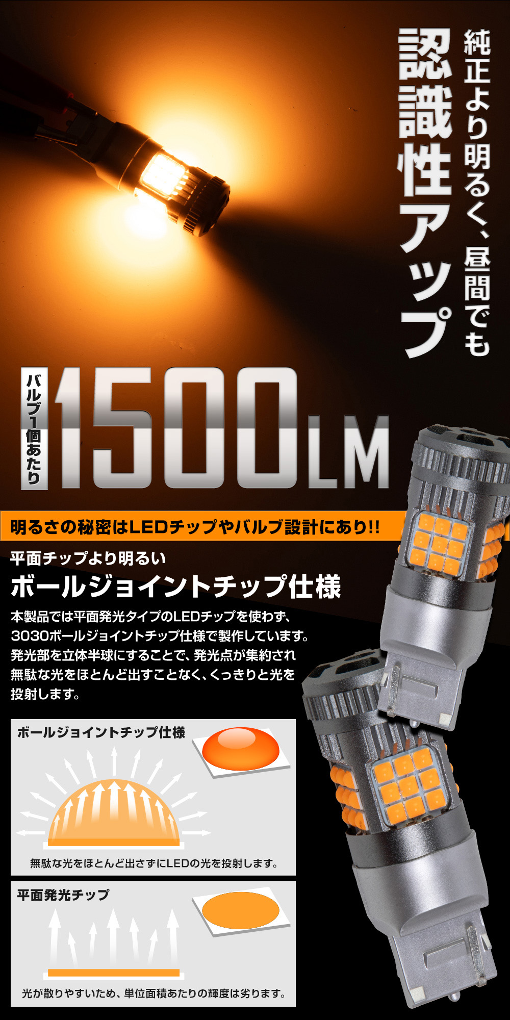 | 純正より明るく、キレの良いウインカーバルブで、昼間でも明るく認識性も抜群! ■平面チップより明るいボールジョイントチップ仕様 本製品では平面発光タイプのLEDチップを使わず、3030ボールジョイントチップ仕様で製作しています。 発光部を立体半球にすることで、発光点が集約され無駄な光をほとんど出すことなく、くっきりと光を投射します。 |