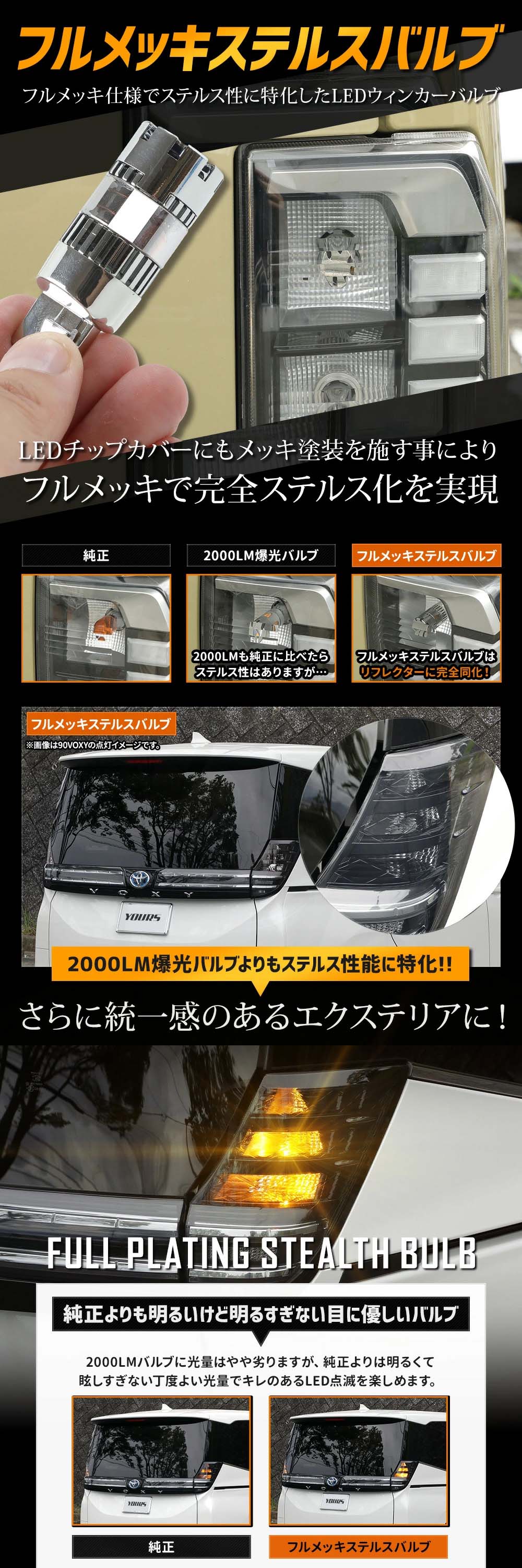 | バルブボディをリフレクター内に馴染みやすいフルメッキにすることで純正のアンバー色が見える外貌を改善しました! 本製品にはLEDチップカバーにもメッキ塗装を施す事によりフルメッキで完全ステルス化を実現! 純正は非点灯時にレンズ内にオレンジ色が映り込み、せっかくのクリアレンズが台無しに… LEDバルブは、非点灯時の余計な映り込みも無く、すっきりシャープなライト回りになり、ファッション性も格段にアップします! 明るさは、2000LMの爆光バルブにはやや劣りますが純正よりも明るく、抵抗内蔵タイプなのでポン付けでキレのあるLEDの点滅を楽しめます。 |