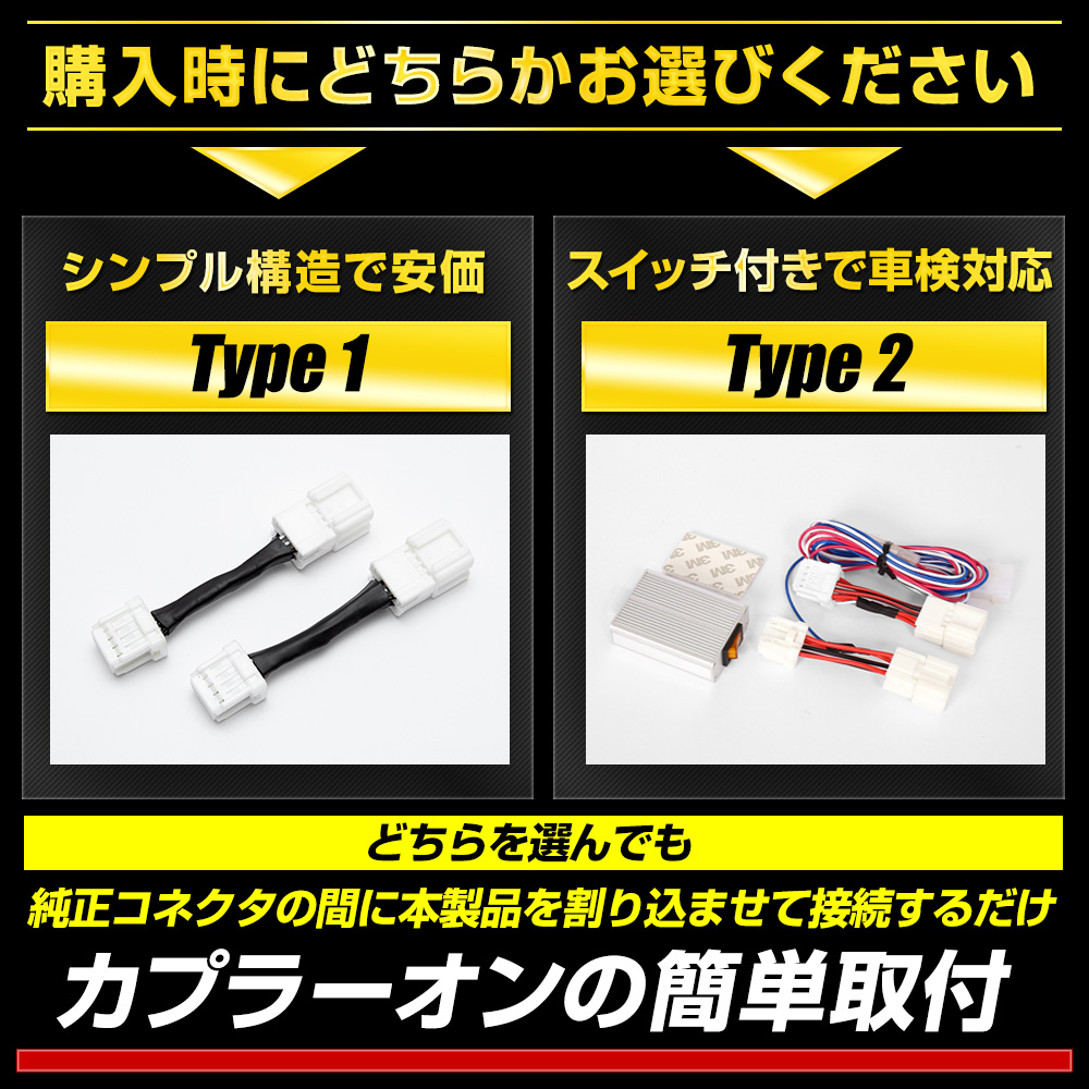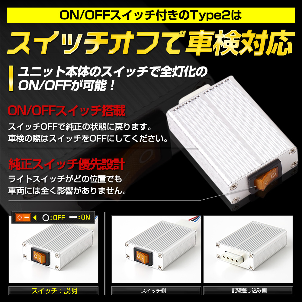 | Type2はスイッチをOFFにした状態であれば車検対応となりますが、Type1は商品を取り外す必要があります。 |