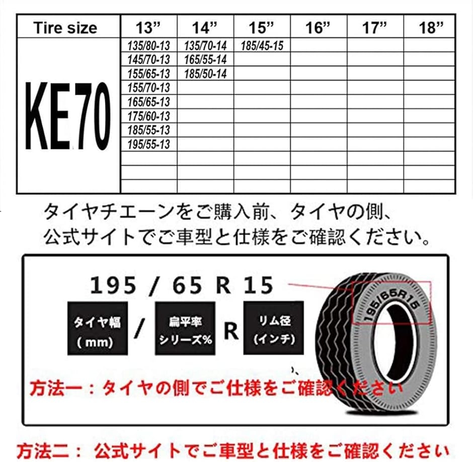 KE70適応タイヤ: 135R13 145/70R13 155/70R13 175/60R13 195/55R13 155/65R13 165/65R13 185/55R13 135/80R13 135/70R14 185/50R14 165/55R14 165/55R14 185/45R15 145R12 145/80R12 165/70R12