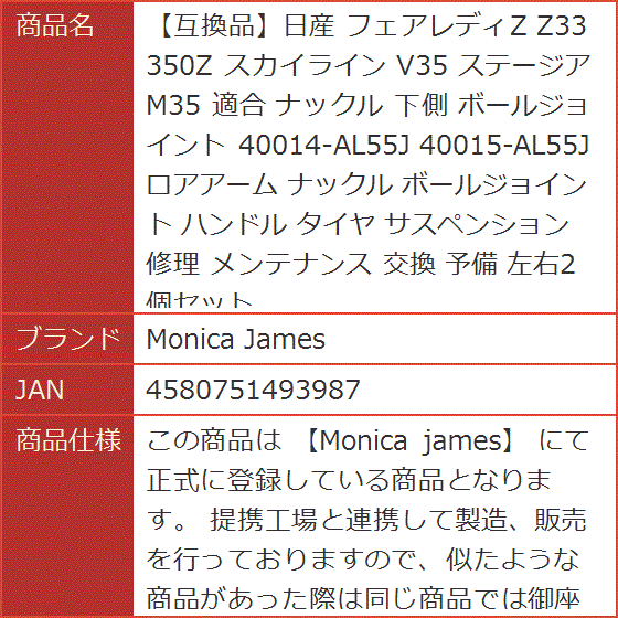 【互換品】日産 フェアレディZ Z33 350Z スカイライン V35 ステージア M35 適合 ナックル 下側 ボールジョイント ロアアーム
