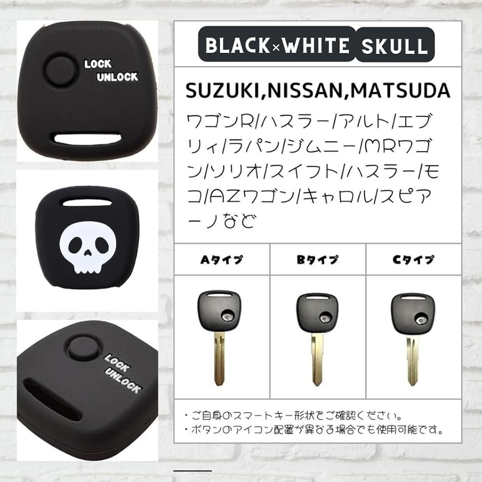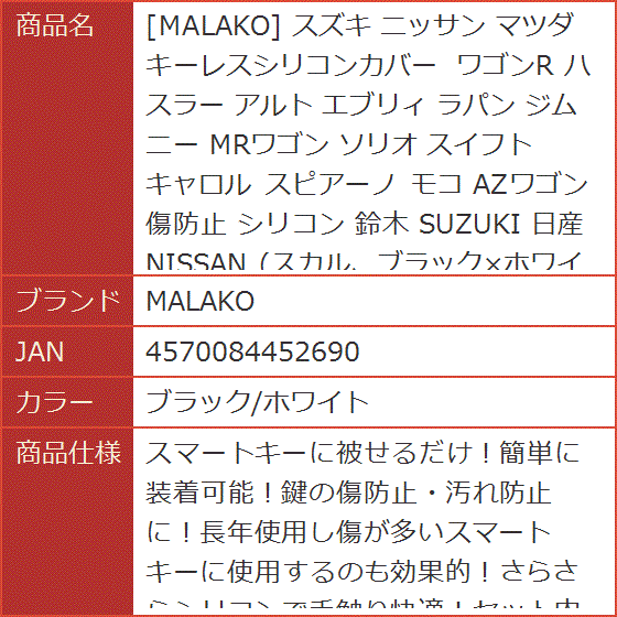 | 商品名 | スズキ ニッサン マツダ キーレスシリコンカバー ワゴンR ハスラー アルト エブリィ ラパン ジムニー MRワゴン ソリオ スイフト キャロル スピアーノ モコ AZワゴン 傷防止 シリコン 鈴木 SUZUKI 日産 NISSAN スカル、ブラックxホワイト |