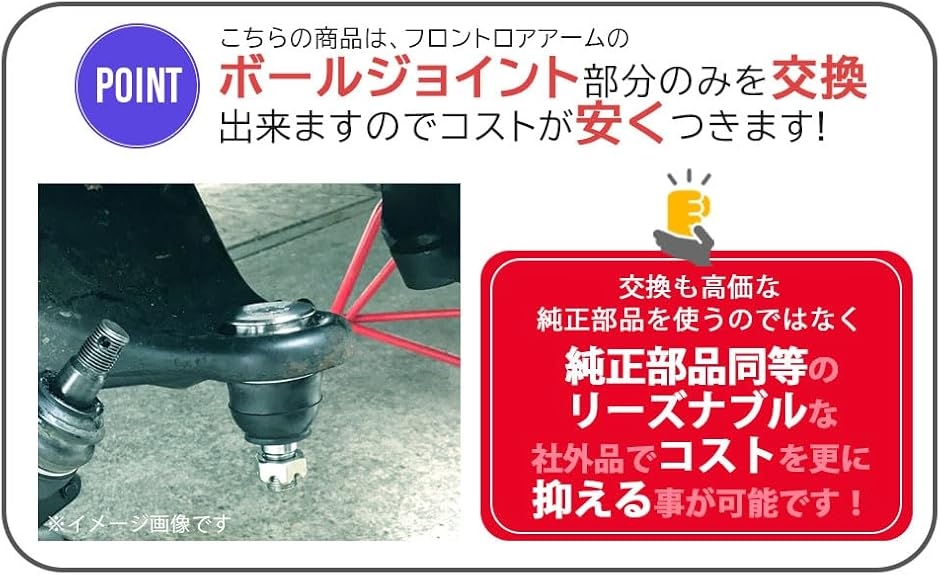 こちらの商品は、フロントロアアームのボールジョイントの部分のみを交換出来ますのでコストが安く済みます。
