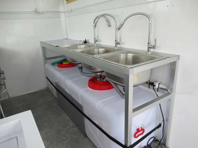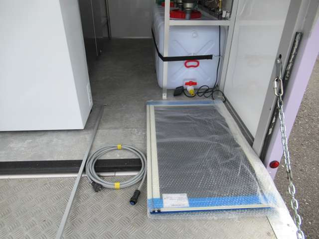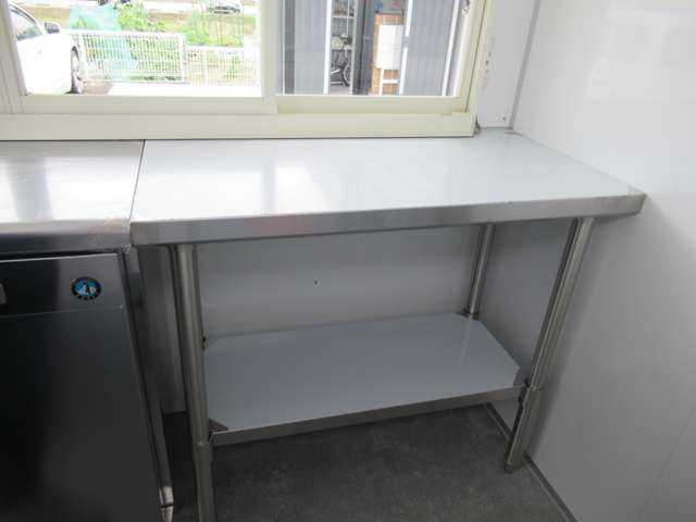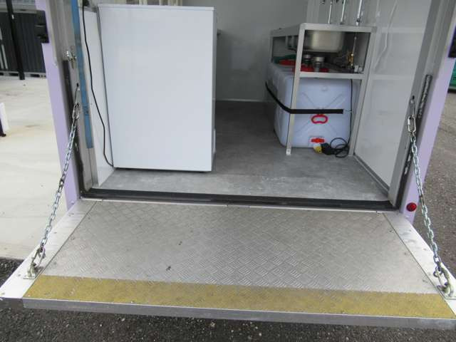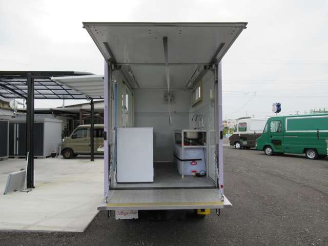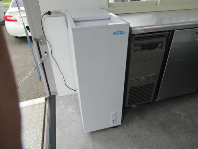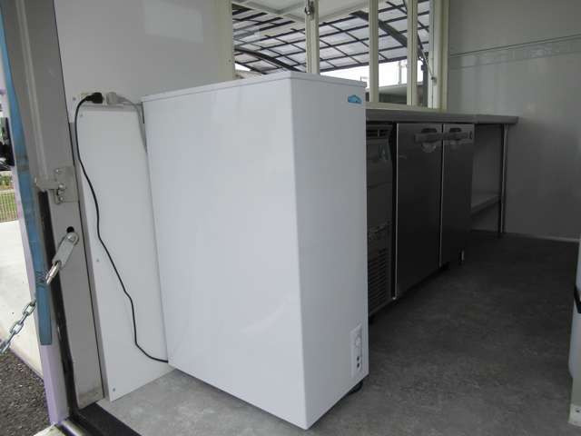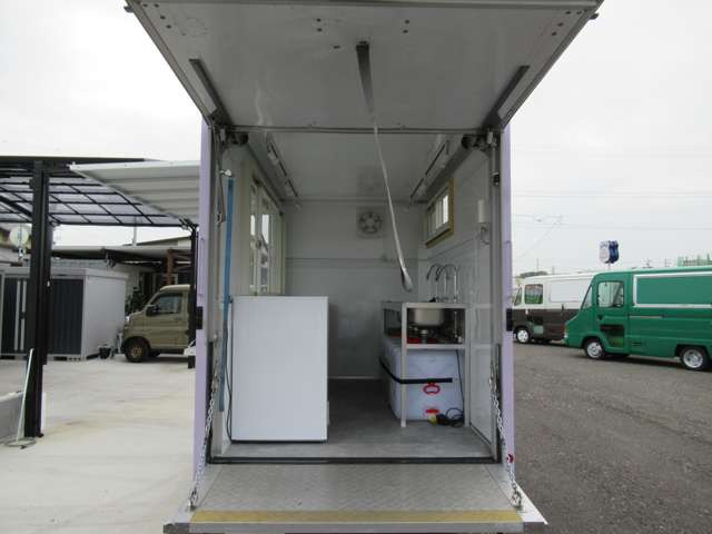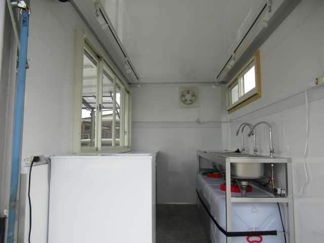 サイド跳ね上げ扉 200L給排水対応シンク ステンレス作業台 LED照明コールドテーブル 冷凍ストッカー 100V外部電源 換気扇 コンセント バックカメラ 庫内設備新品