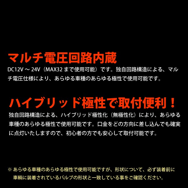 タクシーの行灯や、キャンピングカーの室内灯等、配線が通常の車両以外の配線、そして、車種によっては他の電装品等の影響を受けて、LEDが早期に球切れが発生する場合がございます。LEDの早期球切れを防止するには、サージアレスターをご使用下さい。