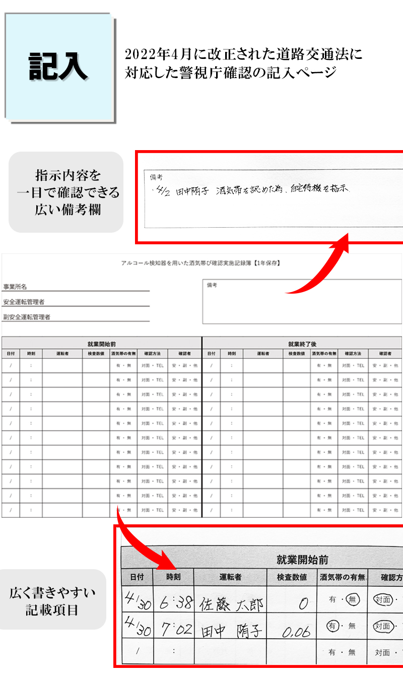 | 商品名 | アルコール検査記録簿 チェックシート 運転者アルコールチェック点呼記録簿 アルコールチェッカー 車 自動車 酒気帯び 記録簿 | |