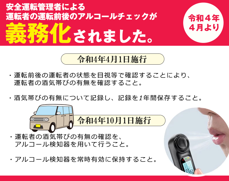 酒気帯びの有無を確認するアルコールチェックとその記録の保存が義務化されました。