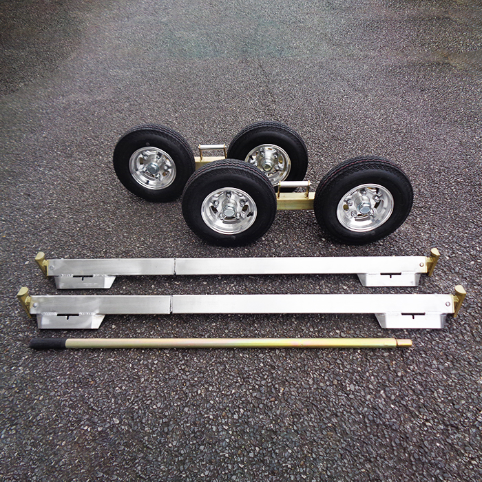 タイヤ付ドーリーボディx2、伸縮式クロスレールx2、丸型アルミニウム製てこ棒x1