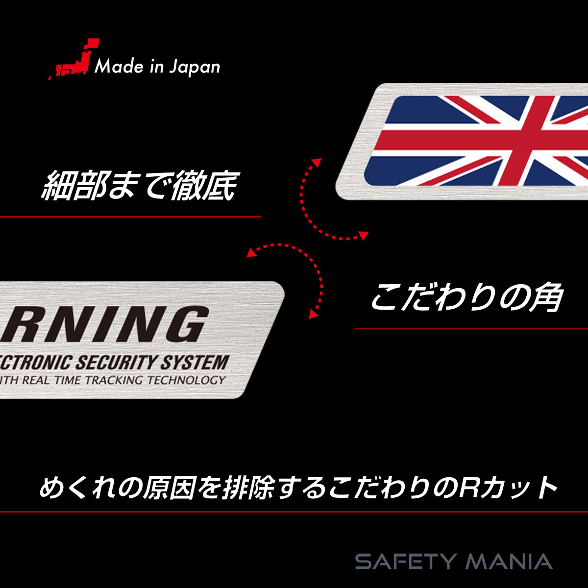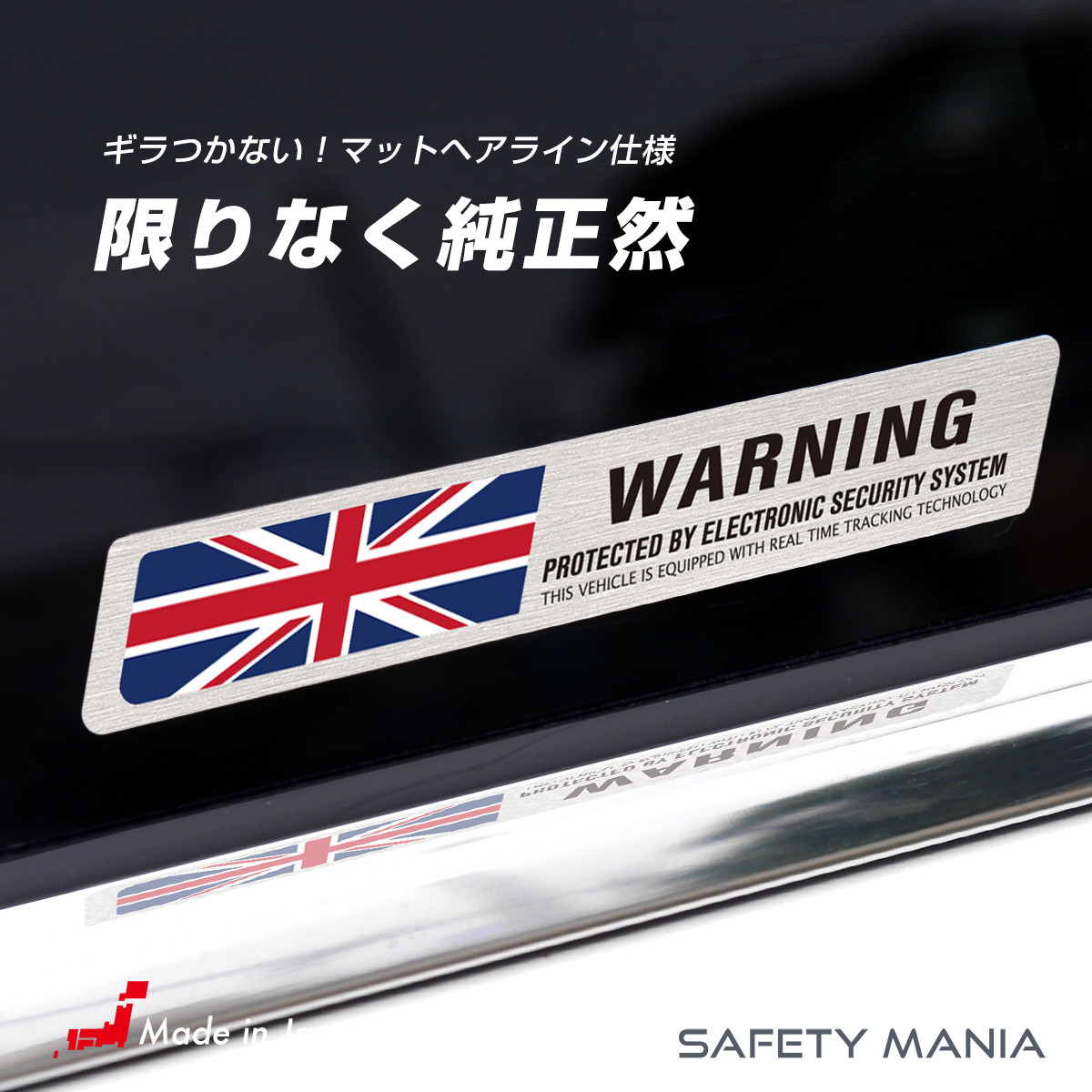 鈍く光る金属の質感が、純正パーツのような高級感を演出。「WARNING」の文字と国旗デザインで、愛車へのイタズラや盗難をスタイリッシュに牽制します。