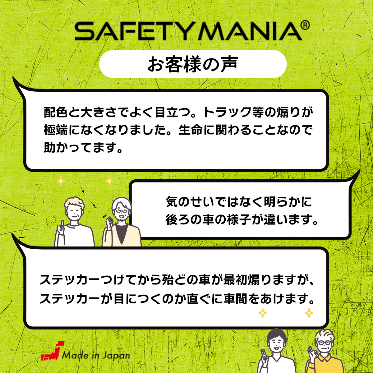 SAFETY MANIAオリジナルの煽り運転防止ステッカー(シールタイプ)です。 後続車に確実な注意を促し、悪質な幅寄せや追突事故を抑止する効果があります。