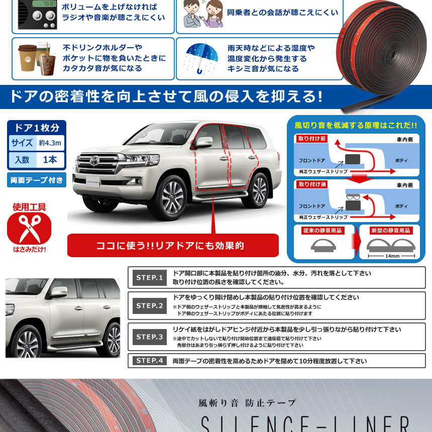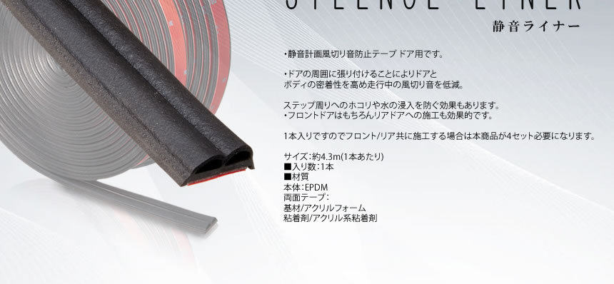 ドアの周囲に張り付けることによりドアとボディの密着性を高め走行中の風切り音を低減。